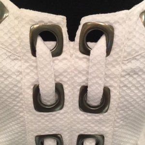 Lovely white Nanette Lepore textured white dress with cap sleeves and interesting metal detail. I wore this only once to a luncheon. Great with flats or heels!