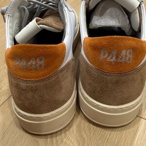 Chic P448 sneakers with a modern look. Features white, gray, and tan hues. Perfect for everyday style.