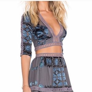 For Love & Lemons Barcelona crop top in black & blue with velvet & embroidered detail