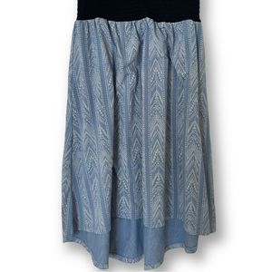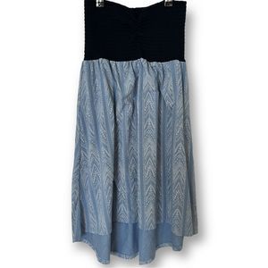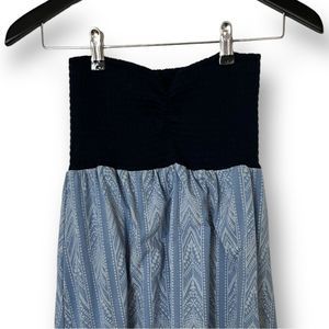 •This has navy blue tube top portion which ends at the bust. The rest of the dress is in a lighter blue and white herringbone / tribal pattern.