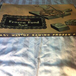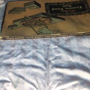 This vintage Hostess brand frozen food saw boasts a durable metal and plastic construction, with a stylish Bakelite handle adding both function and charm. Perfect for any kitchen, this saw is a must-have for any frozen food enthusiast. The saw's character family is Frozen, making it the ideal addition to any Disney-themed kitchen or collection. Whether you're a collector or just looking for a reliable tool to help you cut through frozen food, this Hostess brand saw is sure to impress. Don't miss out on the chance to own a piece of kitchen history. BOX IN PERFECT CONDITION