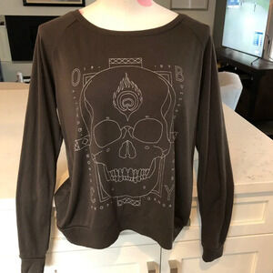 Features: scoop neck, long sleeve, band on cuffs and hem, graphic skull, casual, soft, cozy, neutral