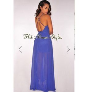Gorgeous Blue Violet Crisscross Back High Slit Maxi Dress from Hot Miami Styles. Never worn and still has original tags.