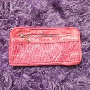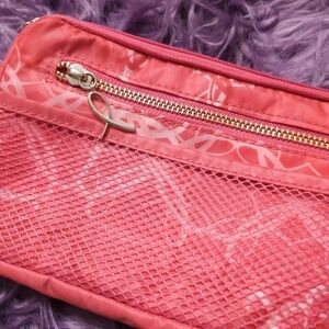 Beautiful hot pink fanny pack supporting breast cancer awareness featuring a zipper pocket & mesh pouch on the outside and a main zipper compartment that offers tons of space inside as well as a zipper pocket on one side & a small pouch to hold your keys in on the other.