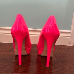 Hot pink, once once, 5.5 inch heel. Some scuff marks from storage.