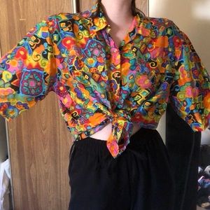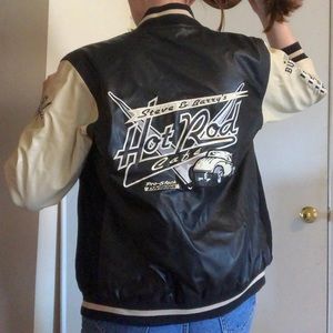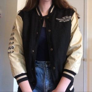 Vintage jacket with interesting patches on front, back, and sleeves.