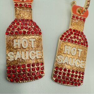 Hot Sauce Bottle Statement Earrings Red and Gold Sparkly Rhinestones