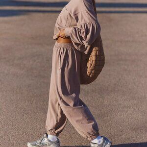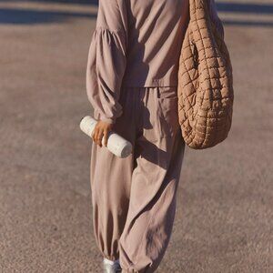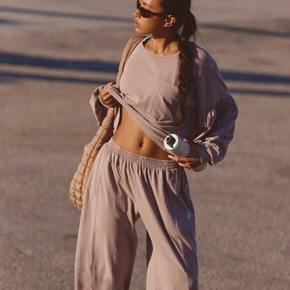 Fit: Relaxed, boxy top; boat neckline; easy-fit joggers; mid-rise; ankle-length.