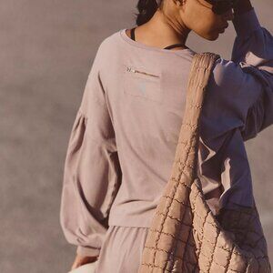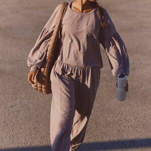 Features: 2-piece set made for casual wear; comfortable cotton construction with a little stretch; boxy, relaxed fit top; pleated long sleeves; boat neckline; tonal seaming;