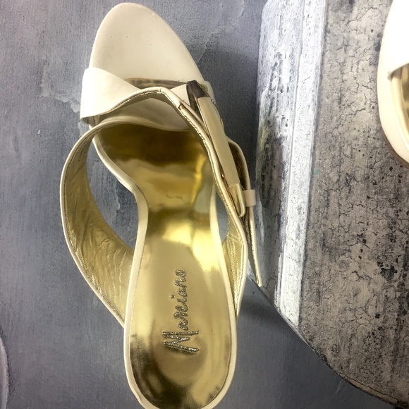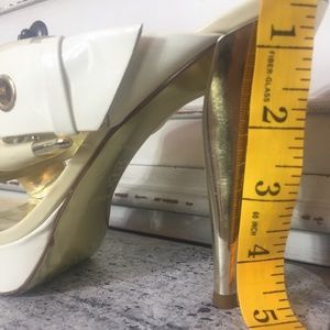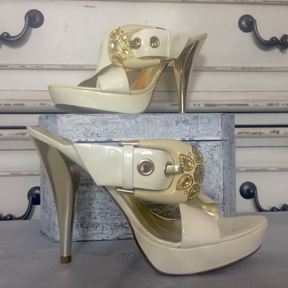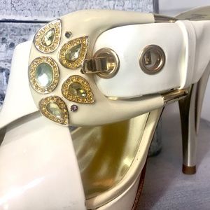 'The Glamorous Life'.. can be found while wearing such gorgeous BEAUTIES! Sometimes it seems as if these darlings belong in a gallery behind glass. White paten leather, bejewelled buckle and gold mirror-like stiletto heal... absolutely STUNNING! Purchased these in taupe/beige and also in white (both are listed). Jewels in buckle are a light peridot green with gold hardware, spectacular. Both pairs were worn once to black tie events. Smoke free, pet free (minus princess Boo-Boo who is not allowed in the closet) immaculate home environment with love.