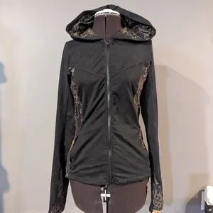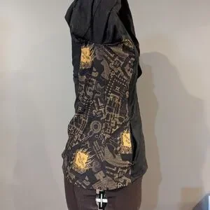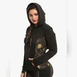 Get your mischief into shape! This black hooded track jacket from Harry Potter is made with a 4-way stretch, breathable, moisture wicking fabric that's perfect for your next workout. The inside of the hood and panels at the waist and sleeves have a gold Marauder's Map print. Add in hidden zipper vertical waist pockets, thumb holes at the sleeves, a mesh inset on the back and a thick drawstring with gold foil "Mischief Managed" text design and you've got a winning track jacket!