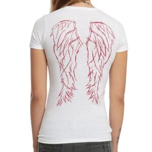 Hot Topic Ophan Black Women's White Sestra Red Winged Back Shirt Size Large - in excellent used condition.