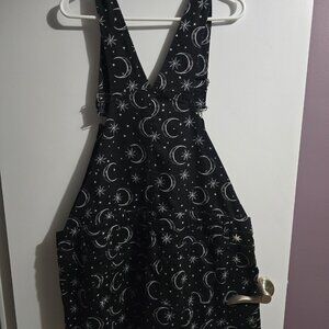 Black with moon and stars pattern. Adjustable and has pockets. Never worn.