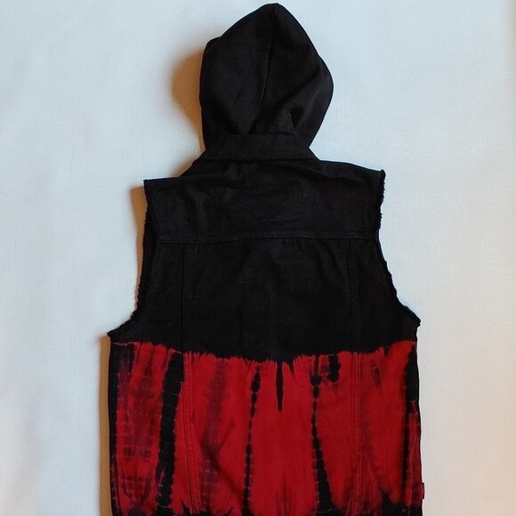 Hot Topic RUDE Denim Vest Two Tone Fire Red Tie Die and Black Hooded Vest
