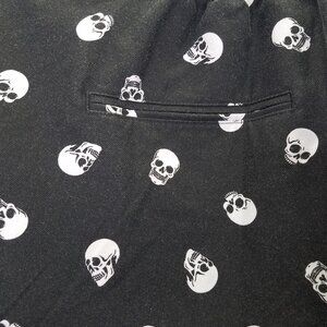 Give your wardrobe a little something grim. These pants have an allover skull pattern and featuring a tapered fit, hip pockets, belt loops, elasticated rear waistband and a zipper and hook closure.