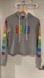 Stay cozy and stylish with this gray hoodie featuring vibrant rainbow hearts on the sleeves. Perfect for adding a pop of color to your wardrobe.