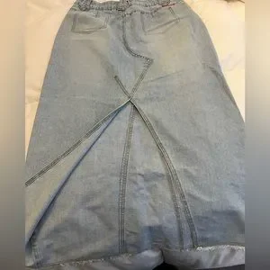 Blue jeans skirt light colour, long open split in the back runs small. Size 13