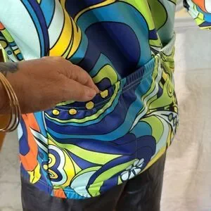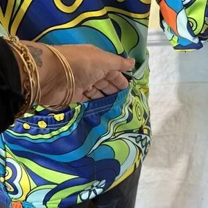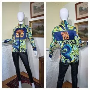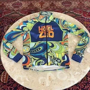 In excellent preowned condition super cool Jakroo bike riding technical jacket (it is stretchy) from Victoria’s trendy Hotel Zed. Featuring a bright retro style multicoloured print, full zip front, zippered side pocket and three back pockets.