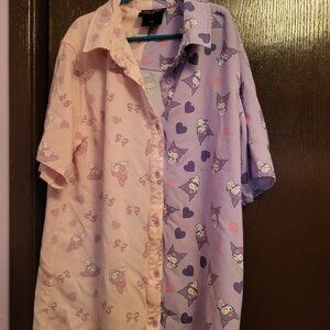 Hottopic My Melody & Kuromi Split Girls Oversized Woven Button-Up! Size Small (but is oversized) super soft but the material wrinkles easily. The design is si oretty but I'm short (5 feet tall) and I found it to be too long for my personal taste.
