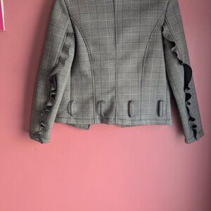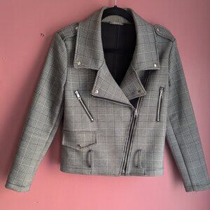 Worn only a handful of times — excellent condition! Heavyweight fabric with a slight stretch, no stains or tears. Features an asymmetrical zip, zip pockets, and a chic collar. The bold black & white dogtooth pattern gives it major style edge.