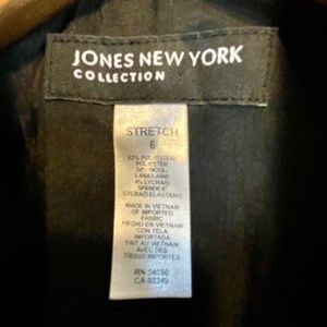 You will feel like Jackie Kennedy in this! Classic swing jacket with light stretch in a black and white houndstooth.  Great with a pencil skirt, pants or jeans.  The fabric has a slight stretch and is quite light despite having a beautiful drape.  There is one very slight imperfection on the back - see the fifth photo. Size 6.