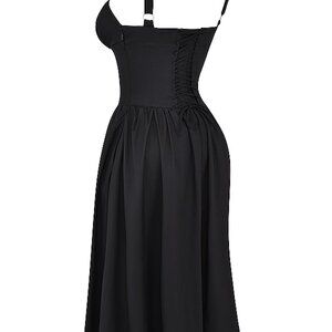 'Tatiana' in black is a modern wardrobe favourite with a vintage feel and beautifully cut from stretch cotton. The sweetheart neckline features soft cups and fitted with our incredible corsetry boning to snatch the waist for an amazing silhouette. It has a lace up back for pretty detailing and buttoned through the front to wear as open and revealing for your desired fit. We love that this beautiful dress is fitted with pockets.