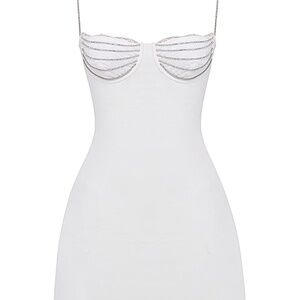 Our 'Grace' dress takes the classic mini dress to a new level of glam, traced with sparkling crystals through the delicate lace cups and along the slender shoulder straps. Cut from our luxurious plush stretch velvet in an ivory hue, 'Grace' is fitted with an internal bra to flatter the bust and fits slim through the body in a thigh skimming mini cut.
