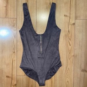 House of CB London “Romane” Gray Vegan Suede Zip front bodysuit