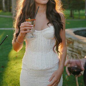The skirt beautifully falls from the hips right down to the floor with a slight flare at the hem and it's lined for an extra luxurious feel. Complete with the sweetest scallop lace trims on the corset and skirt, there's not a detail missed here.