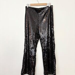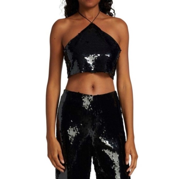 Black glitter 2 piece set featuring a halter top and mid rise crop flare pants, fully lined