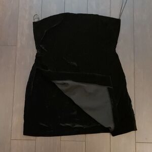 This stunning black bodycon dress from House of Harlow 1960 is perfect for a cocktail night out. Its strapless design and sleek silhouette offer a chic and sophisticated look, while the luxurious velvet fabric adds a touch of elegance.