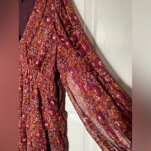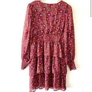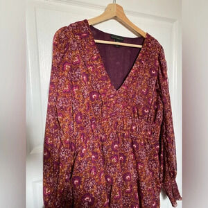 Eye catching and feminine, this ruffled, sheer balloon sleeve v-neck printed dress is threaded with metallic gold flecks which catch in the light in the most stunning way! Gathered elastic waist is both comfortable and flattering!