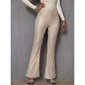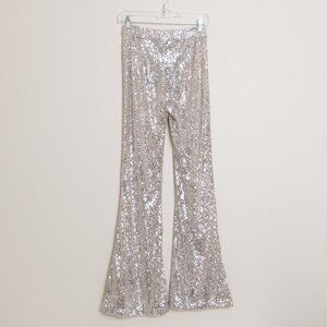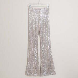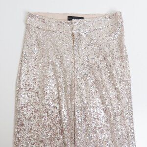 Shine bright in these stunning House of Harlow 1960 sequin flare pants in a chic champagne metallic tone. Perfect for holiday parties, weddings, or a night out, these pants are fully covered in shimmering sequins with a flattering flare-leg silhouette