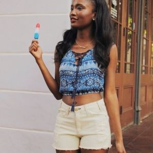 Rich, exotic print in the shades of Chinese porcelain highlight the sexy and chic shape of a breathable crop top with an adjustable tassel tie neckline. A touch of elastic at the hem gives it a playful blouson shape that lend a carefree bohemian, beachy vibe. Pair it with oversized sunglasses for a day spent basking in sunshine. Spaghetti straps Indo blue print 100% Rayon Care: hand wash