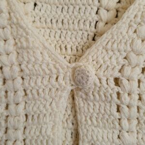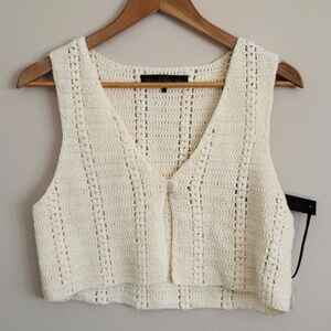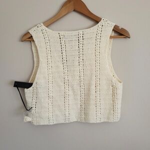Ivory crochet knit vest sold on Revolve. Cotton and Acrylic blend. This is only the vest, there is a skirt that matches but these were not sold as a set.