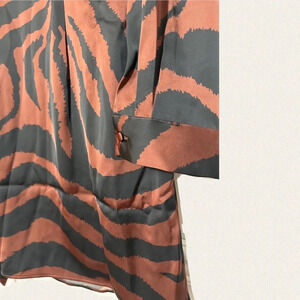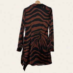 Super fun animal print mini dress. Deep v-neck with collar and long sleeves. Faux wrap design with drape detail at waist (can be styled to hang or tied in a bow). Quality dress by House of Harlow!