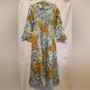 This Vintage robe features a luxurious look and feel, perfect for resort wear. A thin satin polyester feel. Not branded, no tags. Deep pockets on both sides. A half zipper up the front. The blue and green hues create a serene aesthetic, while the mandarin collar adds a touch of sophistication. Ideal for lounging, this robe combines comfort with timeless style. See photos for details.
