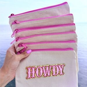 Chic canvas pouches featuring vibrant pink zippers and a playful 'Howdy' design. Ideal for keeping your essentials organized in style- cowgirl style!