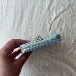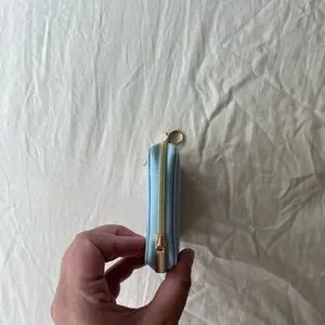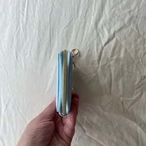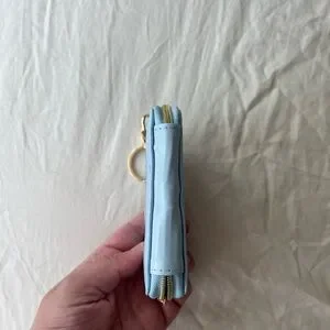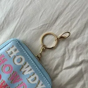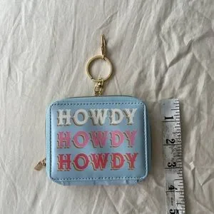 Super cute pastel blue mini zip wallet with gold-tone hardware and a bold western-inspired “HOWDY HOWDY HOWDY” print in white, pink, and red gradient lettering. Features a keychain clip and ring for easy attachment to bags or keys. Perfect for cards, cash, or small essentials on the go. Unlined interior with secure zipper closure.