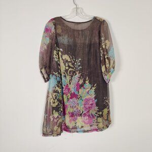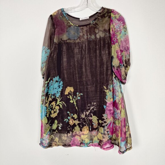 HuaSiJie Women's Blouse Sz L Brown Floral Sheer Lined Cotton Blend Spring Summer