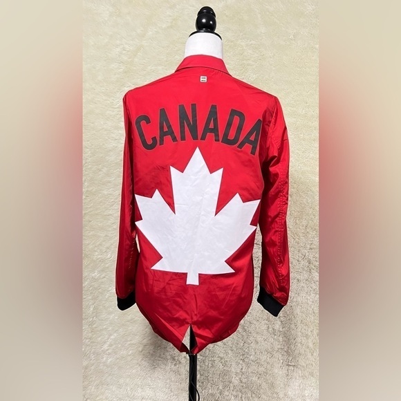 New without tag. Spare button still attached. Red with big maple leaf print at the back. Some marks / scratches on the leaf (pictured). The outer pockets are still stitched shut. Cuffed sleeves.