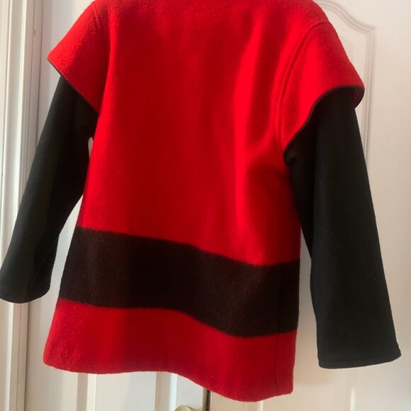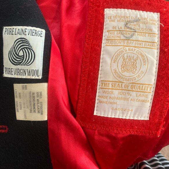 Vintage Hudsn Bay Jacket. 100% Pure Virgin Wool made in Canada. Front - 3 Buttons/Button Holes well stitched, Collared, 2 side pockets that are nicely stitched, Length of Jacket at back is 31 inches , Length of Sleeve is 23 inches, Sleeve has a 5 inch flap & is nicely lined and finished, Width around chest is 42 inches, width around stomach area is 44 inches. Size 10 to 12. Very good Condition, unique look.