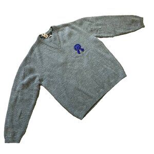 Vintage Hudson Bay Company 100% wool ribbed knit pullover sweater in grey heather. Has textured embroidery applique initial "R" on the left chest. Hand wash or dry clean only (has dry clean tag still attached). Made in Austria. Men's size "L" - see below for garment measurements. Pre-owned vintage condition: wool knit has two mended spots on the right front and on the left sleeve. (Left sleeve had a singe/burn hole, so wool has a small spot of discoloration.) See close-up photos. Some pilling as is typical in a knit garment.