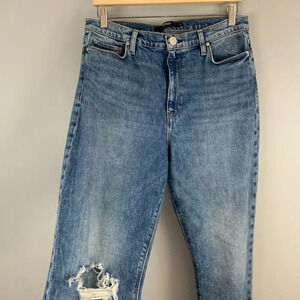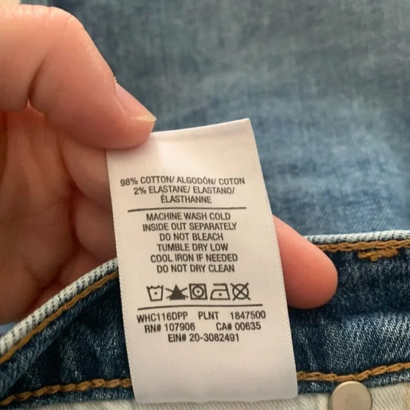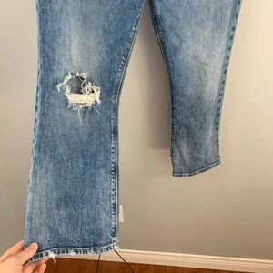 Stylish boot cut jeans. Light blue wash. Distressed detail on knee. Classic five-pocket design. Button and zip closure.