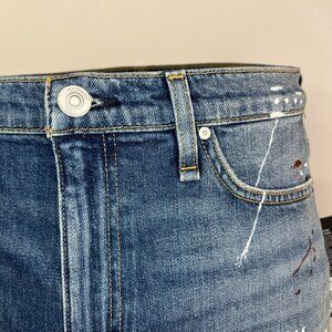 The label's Hana biker shorts in medium-wash denim are distressed with paint-splatter accents and frayed hems for an authentic worn-in feel. Belt loops. Zip fly and button closure. Five pocket styling.