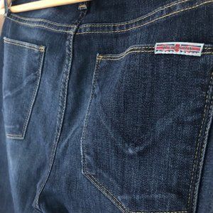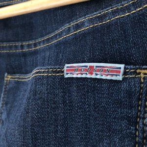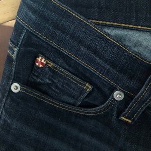Material: 98% cotton, 2% spandex - amazing feel and weight to the denim, perfect whiskering and just enough stretch. Sexy yet understated and incredibly figure flattering. Flattering back pocket details, gold stitching and five pocket styling. Hudson flag logo on front and back pockets. .