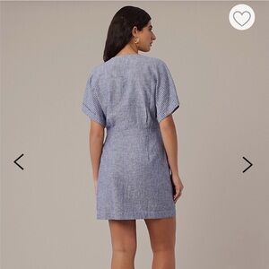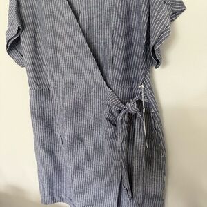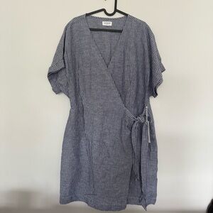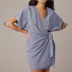 Stylish wrap dress with a tie waist. Features a blue striped pattern. Perfect for casual outings.