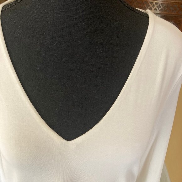 This beautiful and versatile deep V Neck top is stretchy and is cream/off white colour. It can be dressed up or down and goes with everything. The front section is fully lined. Rayon and Spandex. Never worn