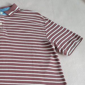 - Fabrics is pale reddish-brown (brownish red?) with white horizontal stripes. The collar has a white stripe trim
