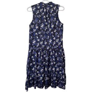 A Hudson North blue floral tiered midi dress. The dress features a two-tone floral print in shades of blue and white on a dark background. It has a V-neckline with delicate ruffle detailing around the collar, and it is a sleeveless design. The dress has a relaxed, tiered smock style, with a drop waist and a tiered skirt that falls to knee length.